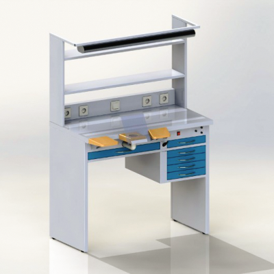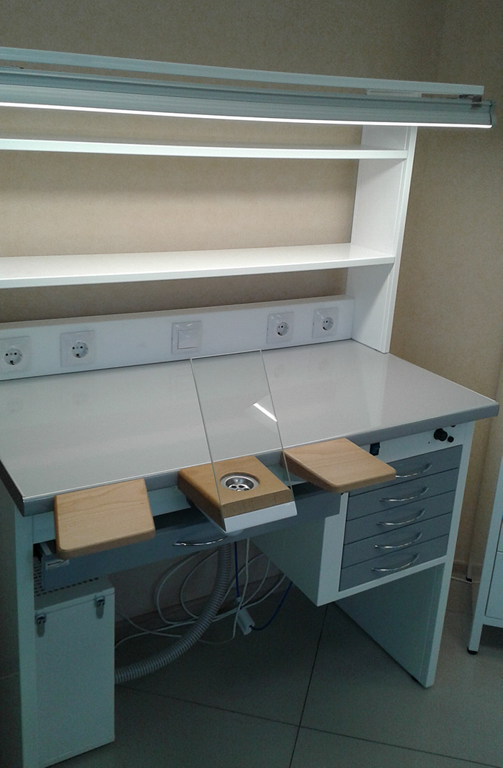 Стол для оборудования рабочего места зубного техника. Оснащается обдувочным соплом, светильником, регулятором мощности вытяжного устройства, подлокотниками.