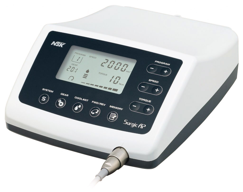 Разработанный специально для стоматологической хирургии и имплантологии Surgic AP обладает всей необходимой мощностью и производительностью для выполнения любых операций в вышеуказанных областях хирургии. Благодаря мощности в 210 Вт, крутящему моменту в 50 Н·см и диапазону скоростей от 200 до 40 000 об/мин, прибор предоставляет широкие возможности и быстрый отклик для проведения различных хирургических операций. Компактный блок управления имеет интуитивно-понятный интерфейс и позволяет с легкостью задавать необходимые параметры работы. Блок управления был специально спроектирован для асептической среды операционного зала.
