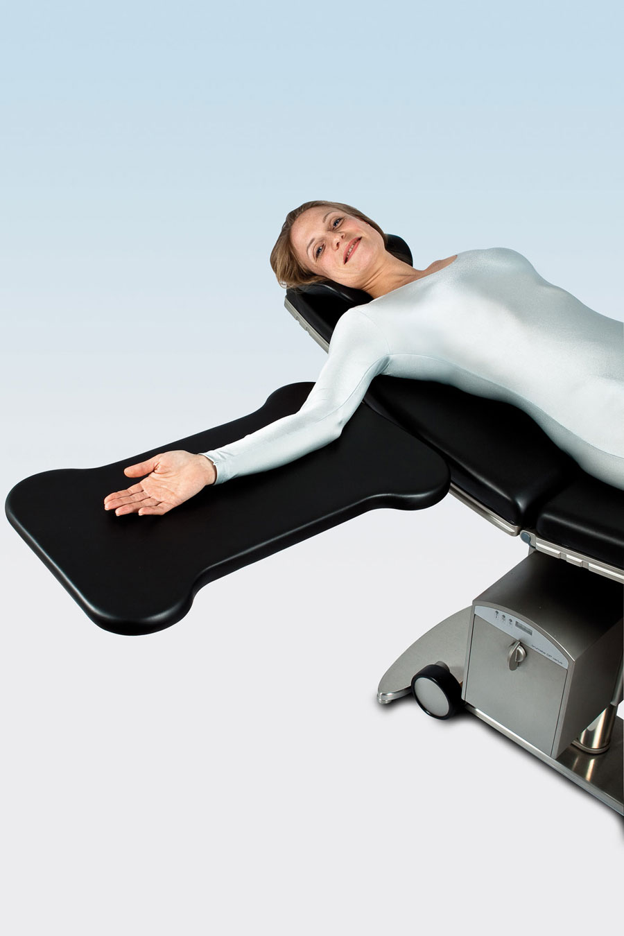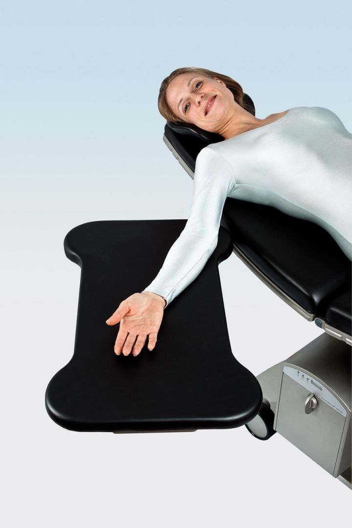 Для правильного, с точки зрения эргономичности, положения рук пациента мы разработали рабочую поверхность с мягкой обивкой и возможностью проведения рентгена. Шаровый шарнир дает возможность разнообразной регулировки, наличие выемок обеспечивает хирургу максимально близкий доступ к пациенту. Крепится при помощи специальных крючков непосредственно на хирургический стол, установка опорных ножек не требуется.