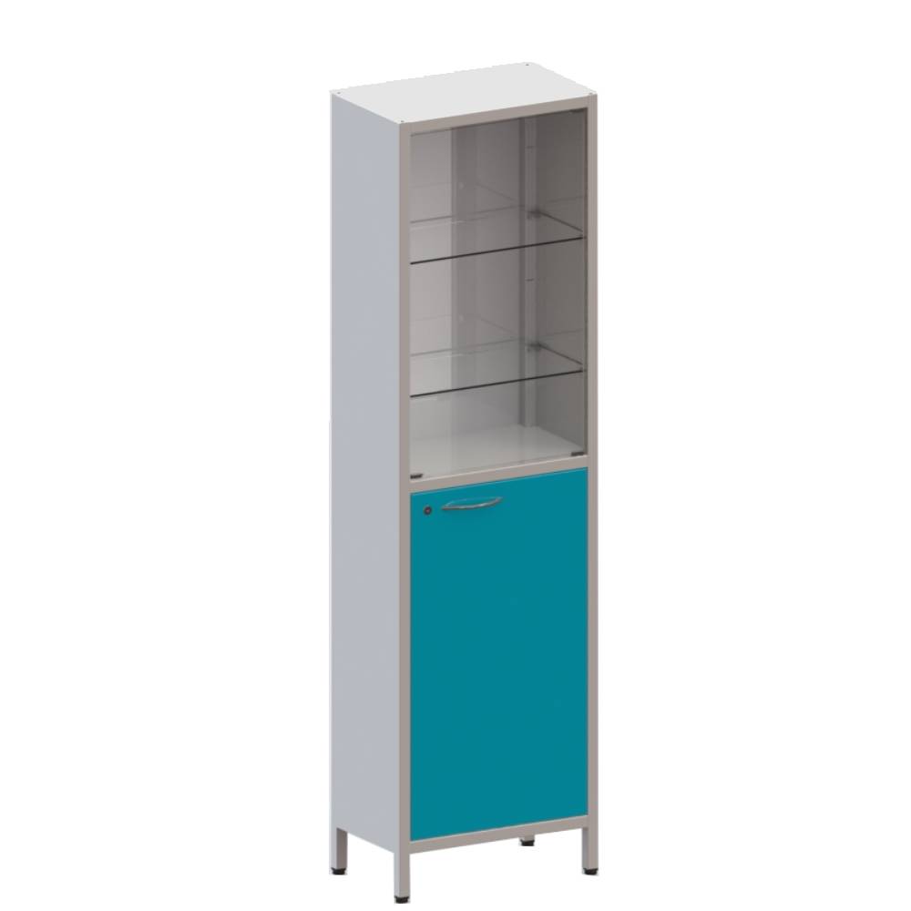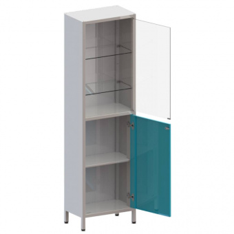 Шкаф одностворчатый на ножках, верхняя секция с дверцей и двумя регулируемыми полками из стекла, нижняя секция с металлической дверцей с замком и металлической полкой.