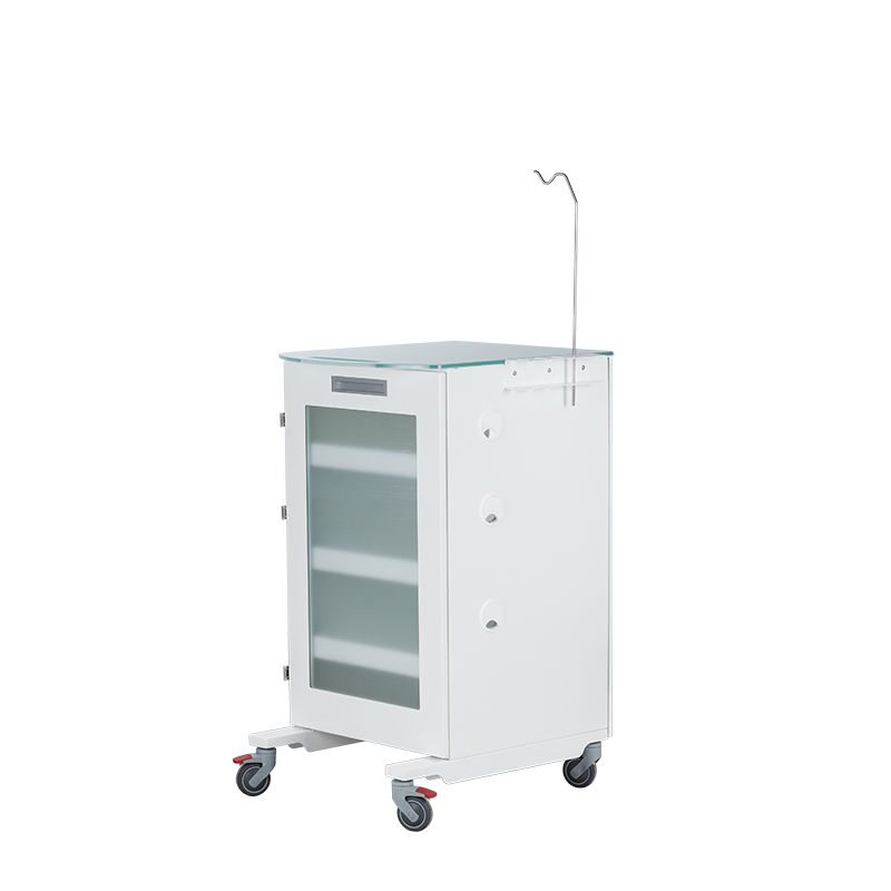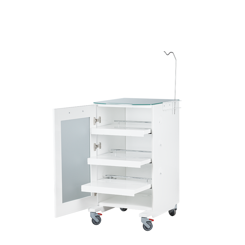 С тремя выдвижными полками. Столик оснащён специализированным держателем для стоматологических наконечников, а также штативом для крепления системы подачи физ.раствора. Столик установлен на колёса диаметром 75мм, два колеса с тормозом.