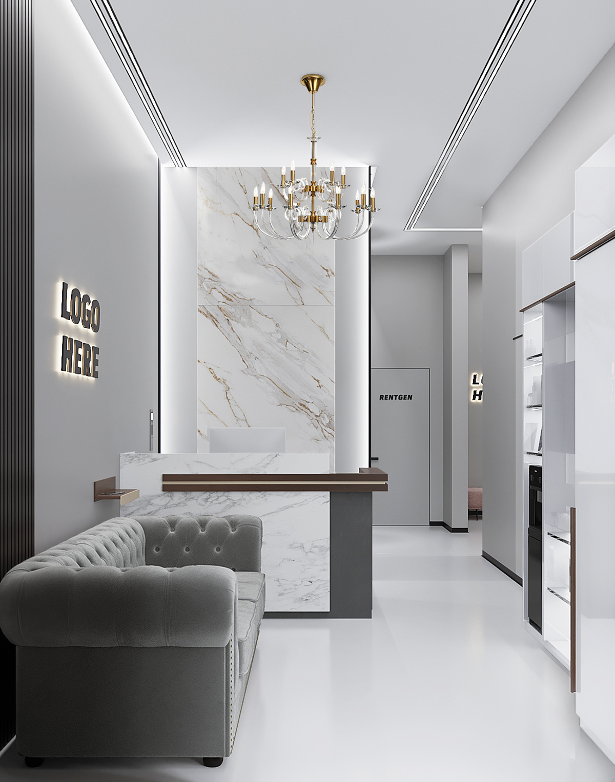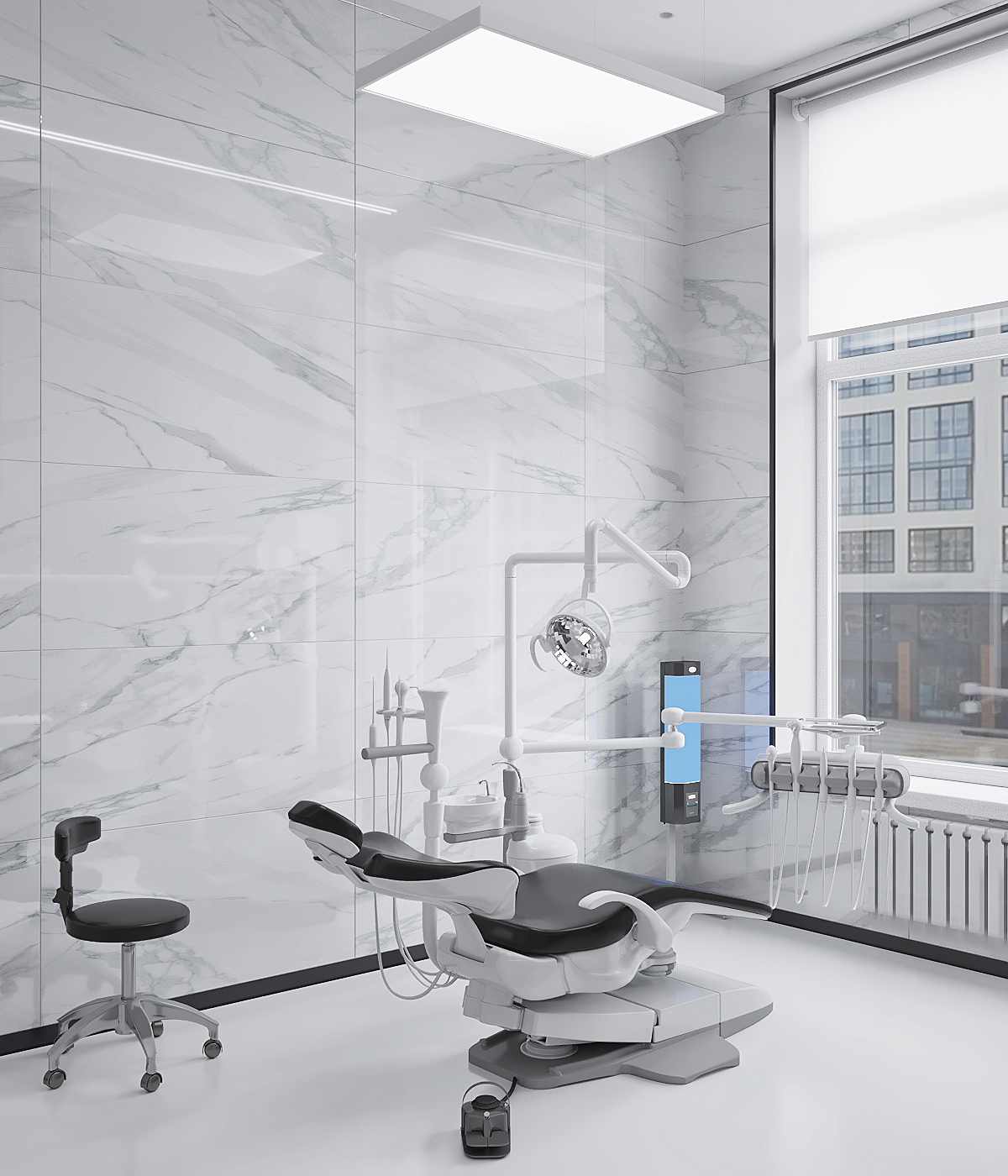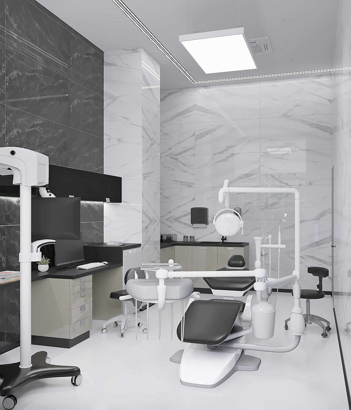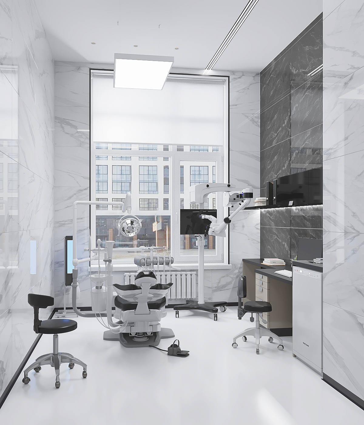Создать уютную стоматологию, используя тёплую цветовую палитру – легко. А что, если разбить стереотипы и отдать предпочтение серым оттенкам и холодным тонам?